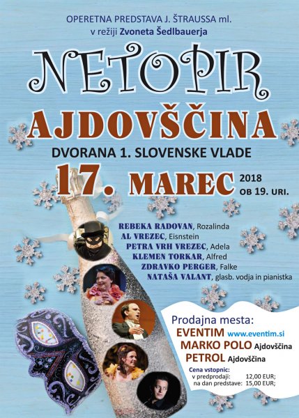 Zgodba, poimenovana Netopir, je operetni biser, znamenita mojstrovina “kralja valčkov” Johanna Straussa ml., ki je do danes po vsem svetu dosegla že na tisoče uprizoritev in verjetno ni opernega odra, na katerem ta opereta ne bi v vsej svoji razkošnosti prikazala radoživosti takratnega dunajskega meščanstva.