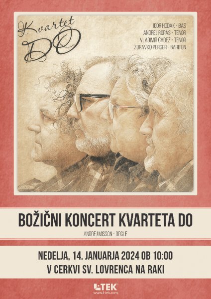 Kvartet je imel svoj prvi na Knobleharjevi akademiji V Škocjanu. Pripravil je program najlepših slovenskih umetnih,narodnih in domoljubnih pesmi, z uvodno slovensko himno in dva celoti po pet pesmi z dodatki. S slovenskim in tujimi skladbami smo nastopili na poslovnem večeru podjetja iz Kitajske in Slovenije na domačiji pri znanem svetovno uveljavljenem vinarju Movija iz Medane v Goriških Brdih. Sedaj pripravljamo koncert slovenskih Božičnih pesmi, ki bo v ljubljanski stolnici, 25.decembra 2023 in ponovitve v mnogih cerkvah širom