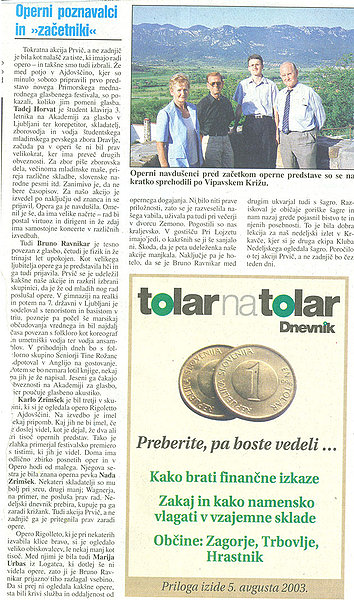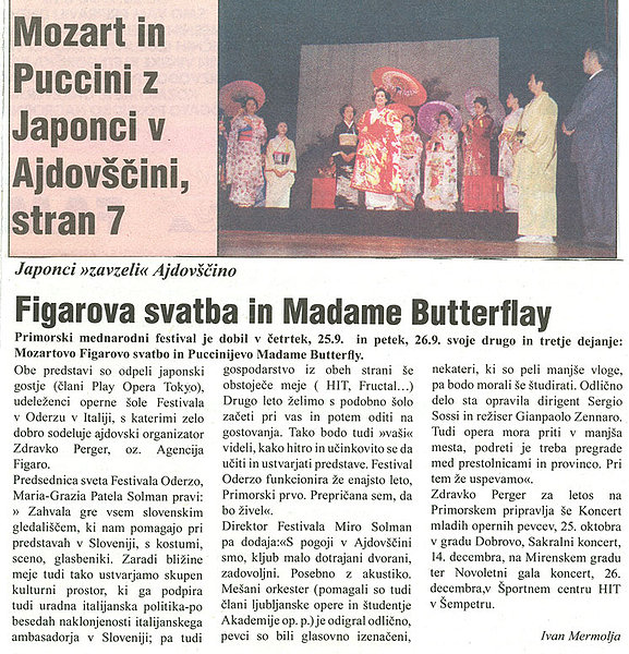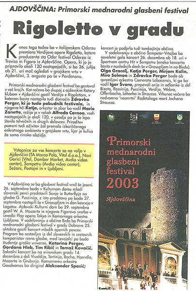 Članek Nedeljskega dnevnika PMGF 2003 Članek Primorske novice PMGF 2993 Predstava Rigoleta Članek Notranjske novice PMGF 2003 Japonci v Logatcu